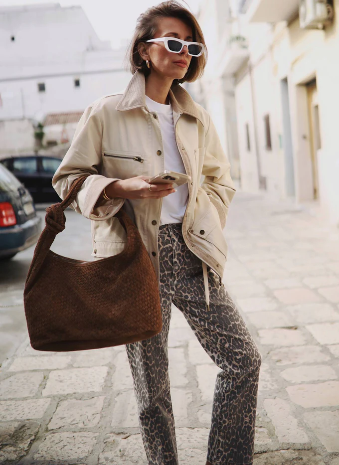 Zanimivo je, da med barvami našega outfita v tem primeru izstopata večno priljubljeni bela in črna. A živalski vzorci se to pomlad pridružujejo tudi masleno rumeni in pastelni pink, najdemo jih v kombinaciji z bordo rdečo ali z barvo leta, omamno rjavo. Super so naprimer potiskane torbe večjih dimenzij in superge ali balerinke z vzorcem, katere dodajamo sicer monokromatskemu videzu. Izredno kul delujejo leopardje ali zebraste hlače, zgrešiti ne moremo s tovrstnim krilom ali celo kratkimi hlačami. Za več opaznosti so tu potiskani trenči, semiš ali denim jakne. In ravno denim je tisti modni faktor, ki ga modne hiše močno izpostavljajo to novo sezono. Le-ta pa seveda odlično paše tudi z živalskim vzorcem.